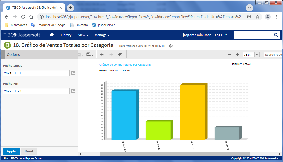 Muestra gráfico de ingresos de ventas por categoría de producto. Se puede filtrar por rango de fechas